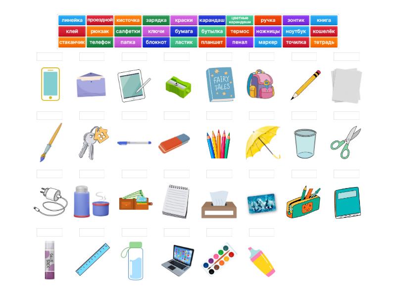 термос, планшет, маркер, зонтик, кошелёк, проездной, ключи, ручка, телефон, зарядка, линейка, блокнот, тетрадь, ластик, точилка, пенал, книга, краски, ножницы, карандаш, клей, салфетки, ноутбук, цветные карандаши, стаканчик, бумага, рюкзак, кисточка, папка, бутылка,