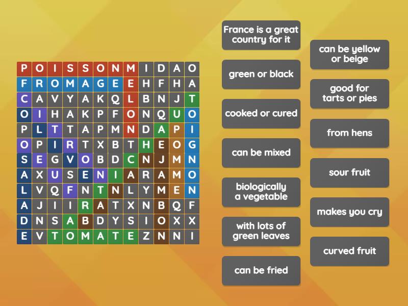 artichaut - with lots of green leaves, citron - sour fruit, melon - can be yellow or beige, oignon - makes you cry, banane - curved fruit, olive - green or black, pomme - good for tarts or pies, tomate - biologically a vegetable, oeuf - from hens, poisson - can be fried, fromage - France is a great country for it, jambon - cooked or cured, salade - can be mixed,