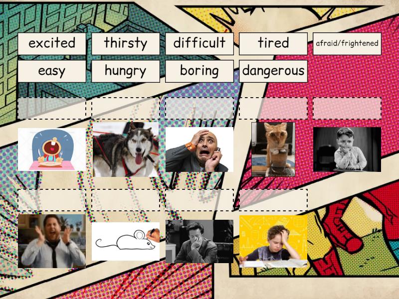 tired, excited, thirsty, hungry, dangerous, boring, difficult, easy, afraid/frightened,