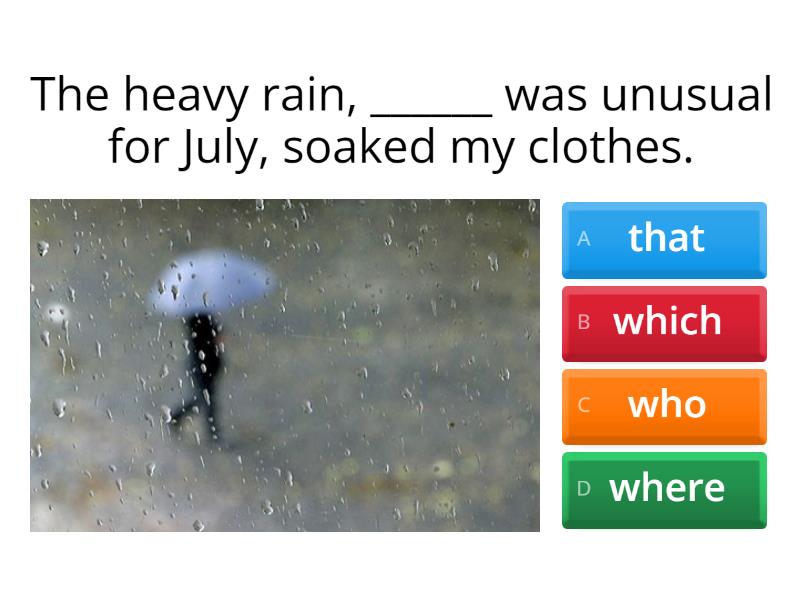 1) The heavy rain, ______ was unusual for July, soaked my clothes. a) that b) which c) who d) where 2) The latest iPhone, _______ comes out in January, costs a lot of money. a) whose b) where c) who d) which 3) Robert’s parents, .......... are retired now, live in Spain. a) where b) whose c) who d) that 4) Sydney, ............. has a population of more than 3 million, is Australian’s largest city. a) where b) which c) whose d) that 5) My uncle John, ........... lives in London, is coming to visit me next week. a) where b) which c) that d) who 6) The church, .... we visited yesterday, is old. a) whose b) which c) when d) where 7) My sister, ..... friend is really good at maths, failed her maths exam. a) which b) who c) whose d) that 8) The cafe, ..... the series Friends was filmed, is very expensive. a) when b) that c) which d) where 9) My teacher, ... car has GPS, got lost in New York. a) whose b) that c) which d) when