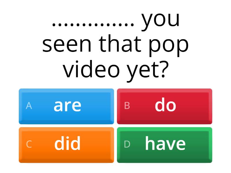 1) .............. you seen that pop video yet? a) are b) do c) did d) have 2) ......... Harry and Gwen going to come to the disco? a) are b) do c) did d) have 3) ........... you buy the concert tickets online yesterday? a) are b) have c) do d) did 4) ............. Lesley told Stephen about the concert? a) are b) do c) did d) have e) has 5) ........... Jane´s birthday next Saturday? a) are b) is c) do d) did 6) ............... Lesley´s parents already bought the tickets? a) are b) did c) have d) has e) do 7) .............. we have to leave the party now? a) are b) have c) do d) did 8) .............. your friend have a favourite band too? a) are b) do c) does d) did 9) .......... our seats near the stage? a) are b) is c) have d) did 10) I ................ some good pictures of the band. a) took b) made 11) I´m ............. my party tomorrow. a) doing b) having 12) I ............ Jane a necklace for her birthday present. a) offered b) gave 13) We always ............ lots of fun at the disco. a) have b) get 14) I´m going to ........... my new white jeans at the concert. a) wear b) carry 15) Would you like to ............. a DVD? a) look b) watch 16) Dad can ............ the concert tickets next week. a) pay b) buy 17) I ........... shopping for some new clothes. a) did b) went 18) My friends and I ............ to music. a) listened b) heard 19) I can try to ............ all your questions. a) answer b) reply 20) I´m going to a concert ........... at Plaza Theatre tomorrow. a) what b) which c) where 21) I´m going to have a snack in the coffee bar first, ......... we´ll go to the theatre. a) than b) then 22) We´ll go to the cinema .......... is only about 20 minutes away. a) who b) which c) where 23) Tigers are more dangerous ........... zebras. a) than b) then