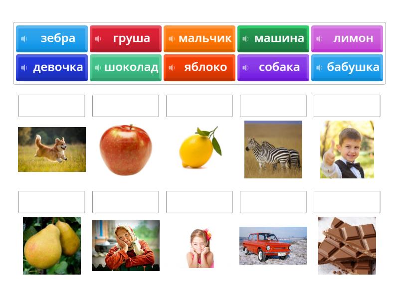 груша, собака, бабушка, шоколад, яблоко, лимон, девочка , мальчик, зебра, машина,
