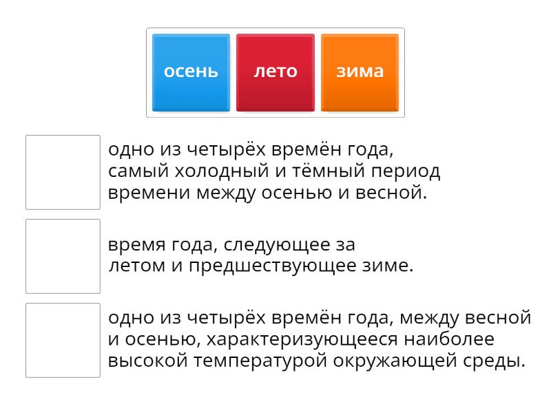 зима - одно из четырёх времён года, самый холодный и тёмный период времени между осенью и весной., лето - одно из четырёх времён года, между весной и осенью, характеризующееся наиболее высокой температурой окружающей среды., осень - время года, следующее за летом и предшествующее зиме.,
