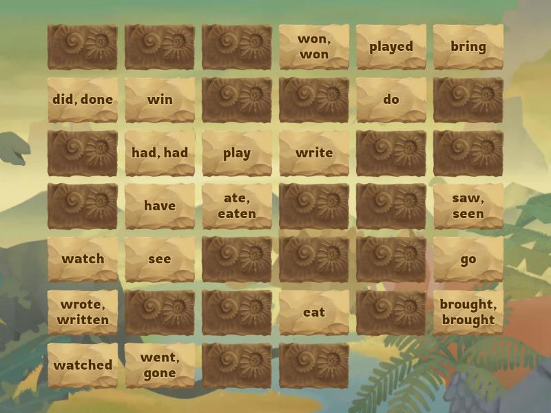 go - went, gone, bring - brought, brought, have - had, had, win - won, won, eat - ate, eaten, do - did, done, see - saw, seen, play - played, watch - watched, write - wrote, written, forget - forgot, forgotten, speak - spoke, spoken, talk - talked, be - was/were, been, work - worked, take - took, taken, run - ran, run, understand - understood, understood, know - knew, known, drink - drank, drunk,
