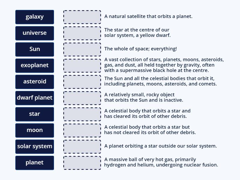 planet - A celestial body that orbits a star and has cleared its orbit of other debris., dwarf planet - A celestial body that orbits a star but has not cleared its orbit of other debris., moon - A natural satellite that orbits a planet., Sun - The star at the centre of our solar system, a yellow dwarf., asteroid - A relatively small, rocky object that orbits the Sun and is inactive., solar system - The Sun and all the celestial bodies that orbit it, including planets, moons, asteroids, and comets., exoplanet - A planet orbiting a star outside our solar system., star - A massive ball of very hot gas, primarily hydrogen and helium, undergoing nuclear fusion., galaxy - A vast collection of stars, planets, moons, asteroids, gas, and dust, all held together by gravity, often with a supermassive black hole at the centre., universe - The whole of space; everything!,