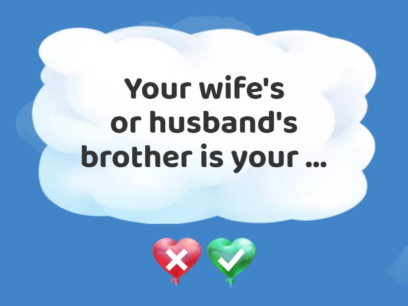 You mother and father are your ... - parents, Your grandfather's father is your ... - great-grandfather, A child who has no brothers or sisters is ... - an only child, Your brother's or sister's daughter is your... - niece, A child who parents take into their family and treat as their own is... - an adopted child, You partner, children, parents, brothers and sisters is your... - immediate family, Your father's new wife is your... - stepmother, Your wife's or husband's brother is your ... - brother-in-law, A sister who shares one parent with you is your... - half-sister, Your brothers and sisters are your... - siblings, You grandparents, aunts, uncles and cousins are your... - extended family, Your brother's or sister's son is your... - nephew,