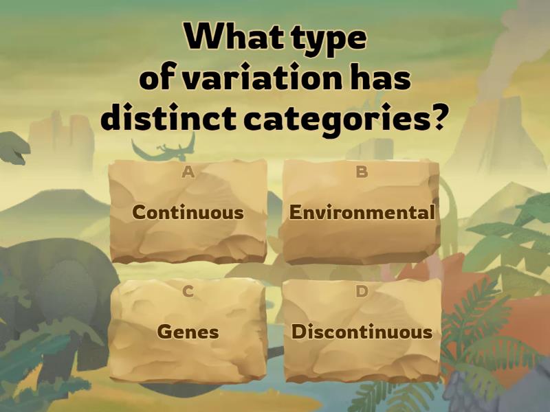 1) What type of variation has distinct categories? a) Continuous b) Environmental c) Genes d) Discontinuous  2) What shape is a DNA molecule? a) Helix b) Double helix c) Spherical 3) Inherited from our parents, what is the basic unit of genetic material a) Gene b) Allele c) Environmental characteristic d) Double helix 4) Which organelle controls the cell and contains the chromosomes? a) Cytoplasm b) Nucleus c) Cell membrane d) Ribosome 5) What is evolution? a) A random process that happens over a few years b) The reason animals become extinct c) Changes in inherited characteristics occurring slowly over time 6) Why are fossils used to prove evolution happen? a) Fossils are always created during any environmental conditions b) They are nice to look at c) They provide evidence of different species from a long time ago 7) Why do animals become extinct? a) When animals can't find food b) Predators, disease, hunting and climate change c) Animals can't fly 8) All dogs belong to the same a) Breed b) Species c) Variety 9) What can all organisms of the same species do? a) Reproduce to have fertilile offspring b) Produce lots of offspring
