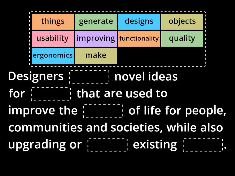 Designers ____ novel ideas for ____ that are used to improve the ____ of life for people, communities and societies, while also upgrading or ____ existing ____. Among other things, ____ ____ objects including but not limited to products and ____, furniture, fittings and ____, transport, appliances, ____ and machinery, ____, toys, ____ and displays. Important ____ to consider when designing objects might include but are not limited to ____, ergonomics, the ____ of materials and manufacturing processes, ____, usability and ____. Among those who develop objects the following can include but are not limited to ____, product, graphic, ____, ____, textile and fashion ____.