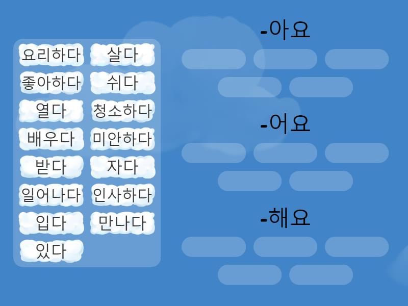-아요: 살다, 만나다, 받다, 자다, 일어나다, -어요: 배우다, 있다, 쉬다, 입다, 열다, -해요: 좋아하다, 인사하다, 청소하다, 미안하다, 요리하다,