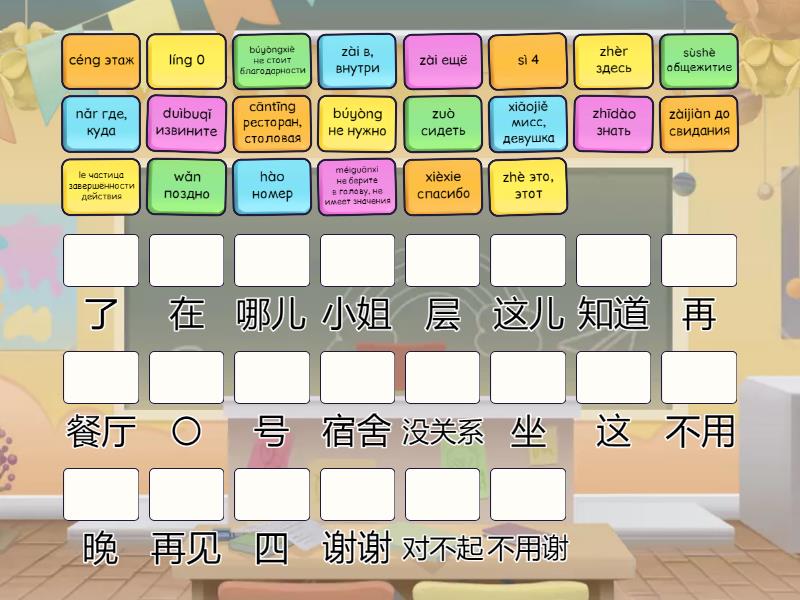 cāntīng ресторан, столовая - 餐厅, nǎr где, куда - 哪儿, zài в, внутри - 在, sùshè общежитие - 宿舍, zuò сидеть - 坐, xièxie спасибо - 谢谢, duìbuqǐ извините - 对不起, zhīdào знать - 知道, méiguānxi не берите в голову, не имеет значения - 没关系, hào номер - 号, zàijiàn до свидания - 再见, zài ещё - 再, xiǎojiě мисс, девушка - 小姐, céng этаж - 层, búyòng не нужно - 不用, búyòngxiè не стоит благодарности - 不用谢, zhèr здесь - 这儿, wǎn поздно - 晚, le частица завершённости действия - 了, zhè это, этот - 这, líng 0 - 〇, sì 4 - 四,