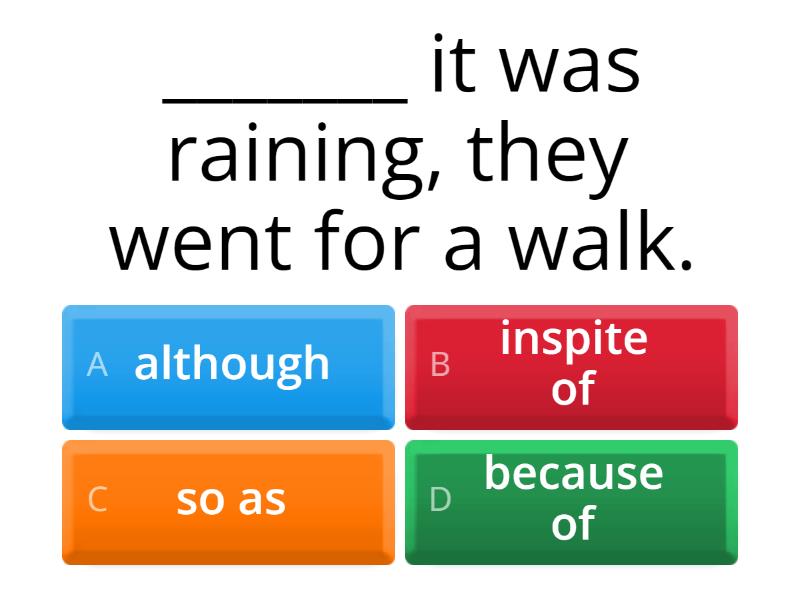 1) _______ it was raining, they went for a walk. a) although b) inspite of c) so as d) because of 2) Clever people ask better questions, and _______ , they get better answers. a) because b) as a result c) however d) so that 3) He asked a stupid question _____ I gave him a stupid answer. a) due to b) so c) although d) so as to 4) ________ her fear of heights, she climbed the mountain. a) because of b) in spite c) despite d) due to 5) It was snowing heavily; _______, the school was closed. a) even though b) therefore c) since d) although 6) They left early ______ they could avoid traffic jams. a) in order to b) although c) so that d) because of 7) _________ being tired, he finished his homework. a) although b) despite c) because of d) in spite 8) They upgraded their security system _________ protect sensitive information. a) in order to b) for c) so that 9) Would you like to go to the park ____ a run? a) to b) for c) due to d) so that 10) _________ the cold weather, she went swimming. a) In spite of b) because c) however d) Although 11) I drank a lot of coffee ______ to fall asleep. a) not in order b) so as not c) despite 12) _______ being ill he went to work. a) Even though b) Although c) Despite