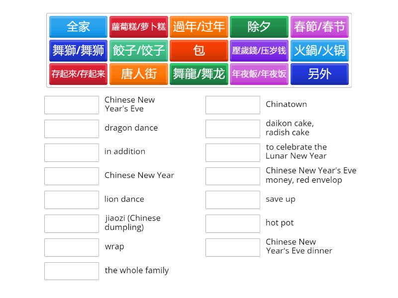 春節/春节 - Chinese New Year, 唐人街 - Chinatown, 舞龍/舞龙 - dragon dance, 舞獅/舞狮 - lion dance, 蘿蔔糕/萝卜糕 - daikon cake, radish cake, 過年/过年 - to celebrate the Lunar New Year, 除夕 - Chinese New Year's Eve, 餃子/饺子 - jiaozi (Chinese dumpling), 包 - wrap, 全家 - the whole family, 年夜飯/年夜饭 - Chinese New Year‘s Eve dinner, 火鍋/火锅 - hot pot, 另外 - in addition, 存起來/存起来 - save up, 壓歲錢/压岁钱 - Chinese New Year's Eve money, red envelop,