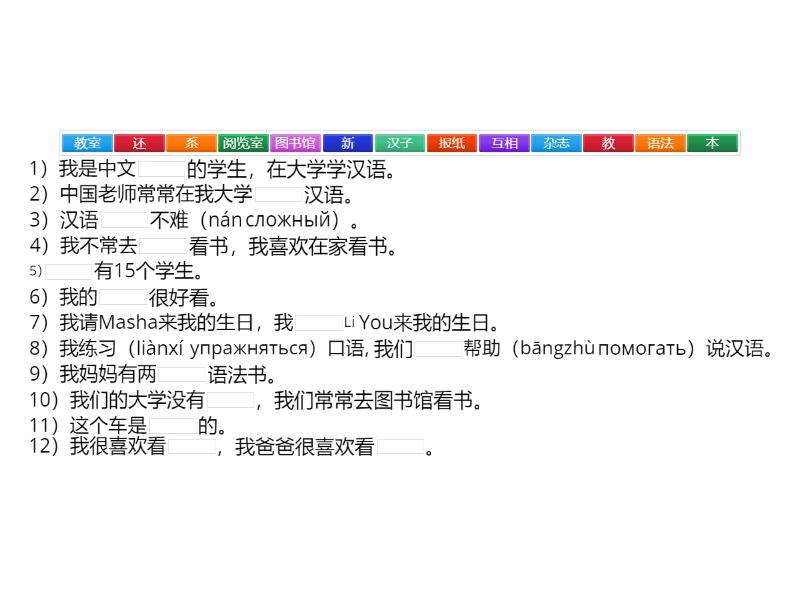 1)我是中文____的学生,在大学学汉语。 2)中国老师常常在我大学____汉语。 3)汉语____不难(nán сложный)。 4)我不常去____看书,我喜欢在家看书。 5)____有15个学生。 6)我的____很好看。 7)我请Masha来我的生日,我____Li You来我的生日。 8)我练习(liànxí упражняться)口语, 我们____帮助(bāngzhù помогать)说汉语。 9)我妈妈有两____语法书。 10)我们的大学没有____,我们常常去图书馆看书。 11)这个车是____的。 12)我很喜欢看____,我爸爸很喜欢看____。