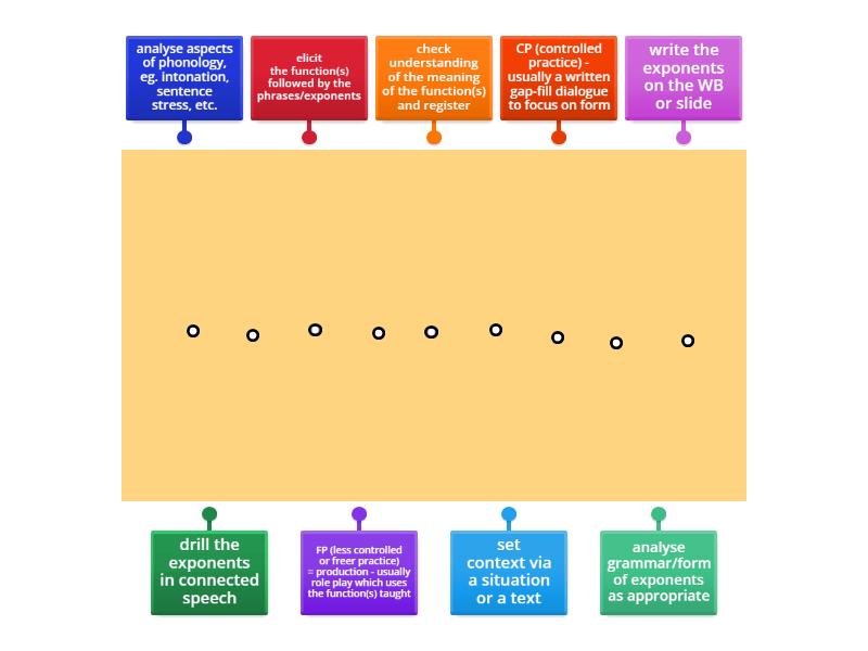 set context via a situation or a text, elicit the function(s) followed by the phrases/exponents, check understanding of the meaning of the function(s) and register, drill the exponents in connected speech, write the exponents on the WB or slide, analyse aspects of phonology, eg. intonation, sentence stress, etc., analyse grammar/form of exponents as appropriate, CP (controlled practice) - usually a written gap-fill dialogue to focus on form, FP (less controlled or freer practice) = production - usually role play which uses the function(s) taught.