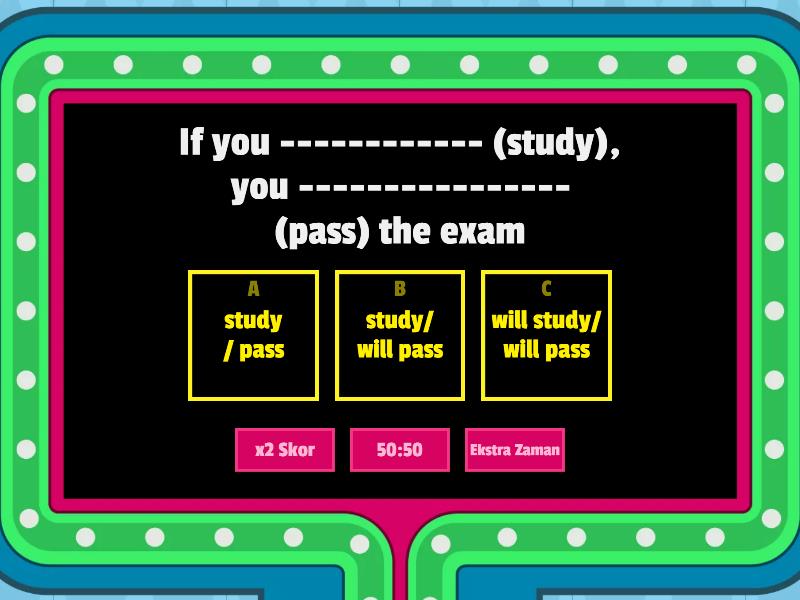 1) If you ------------ (study), you ---------------- (pass) the exam a) study / pass b) study/ will pass c) will study/ will pass 2) If it ---------------- ( rain), we--------------- (cancel )the match. a) rains/will cancel b) will rain/ cancel c) rain/ will cancel 3) Henry _____ (get) cold , if he _____ (go) out today. It's -7 o C a) will get / goes out b) will get / will go c) gets cold-/goes out 4) If you _____ (ride) your bicycle carelessly , you _____ (have) an accident. a) will ride/ have b) will ride/ will have c) ride/ will have 5) If you --------- (make) noise again , I --------------(call) the police a) make/ will call b) will make/ will call c) will make/ call 6) If you --------------(be) away, I ------------ (feed) your cat. a) are /will feed b) are/ feed c) will be /am