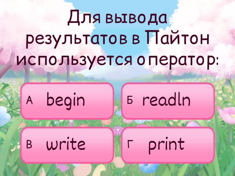 1) Языковые конструкции, с помощью которых в программах записываются действия, выполняемые в процессе решения задачи, называются: a) циклами b) условными операторами c) выражениями d) данными 2) Разделителями между операторами служит: a) точка b) точка с запятой c) пробел d) запятая 3) Описать переменную - это значит указать её: a) имя и значение b) имя и тип c) тип и значение d) имя, тип и значение 4) Какая клавиша нажимается после набора последнего данного в операторе read? a) Enter b) точка с запятой c) пробел d) Ctrl 5) При присваивании изменяется: a) имя переменной b) тип переменной c) значение переменной d) значение константы 6) Для вывода результатов в Пайтон используется оператор: a) begin b) readln c) write d) print 7) Для вычисления квадратного корня из x используется функция: a) abs (x) b) sqr (x) c) math.sqrt (x) d) int (x)