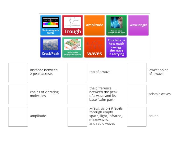 waves - chains of vibrating molecules, This can travel through air and liquid - sound, These travel through the ground - seismic waves, Electromagnetic Waves - x-rays, visible (travels through empty space) light, infrared, microwaves, and radio waves, Crest/Peak - top of a wave, Trough - lowest point of a wave, Amplitude - the difference between the peak of a wave and its base (calm part), This tells us how much energy the wave is carrying  - amplitude, wavelength - distance between 2 peaks/crests,