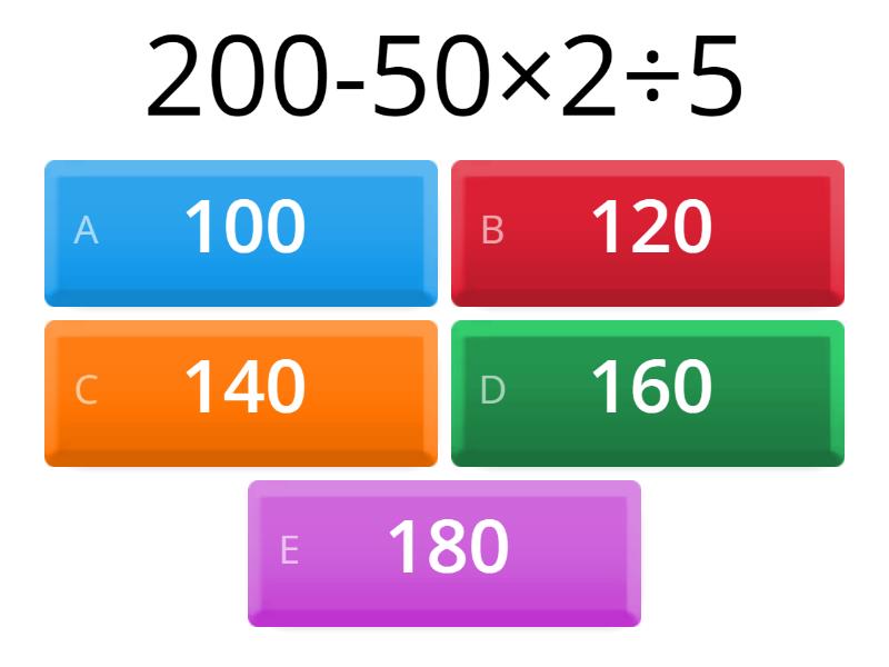 1) 200-50×2÷5 a) 100 b) 120 c) 140 d) 160 e) 180 2) 300÷6×9-440 a) 100 b) 10 c) 0 d) 110 e) 120 3) 44×5×0+78 a) 200 b) 220 c) 78 d) 22 e) 87 4) 121÷11+89×0 a) 89 b) 78 c) 67 d) 100 e) 11 5) 10+10-10×10×0 a) 20 b) 10 c) 0 d) 100 e) 30