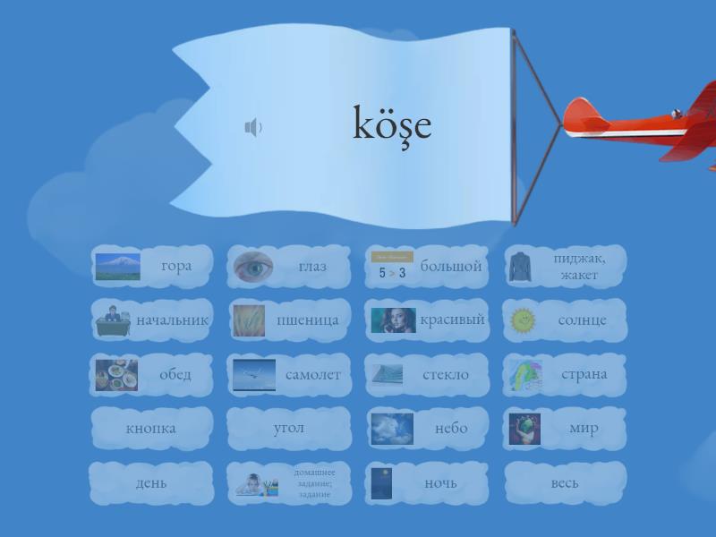угол - köşe, весь - bütün, глаз - göz, домашнее задание; задание - ödev, небо - gök, мир - dünya, день - gün, кнопка - düğme, большой - büyük, красивый - güzel, начальник - müdür, страна - ülke, солнце - güneş, пиджак, жакет - ceket, ночь - gece, стекло - cam, гора - dağ, обед - öğle, самолет - uçak, пшеница - buğday,