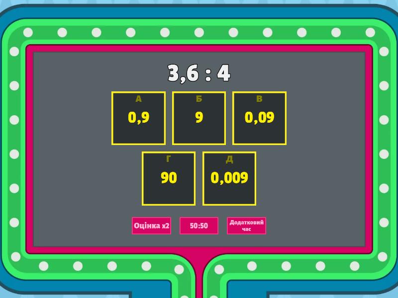 1) 3,6 : 4 a) 0,9 b) 9 c) 0,09 d) 90 e) 0,009 2) 0,36 : 4 a) 0,9 b) 9 c) 0,09 d) 90 e) 0,009 3) 7,5 : 3 a) 2,5 b) 25 c) 0,25 d) 0,025 e) 250 4) 0,75 : 3 a) 2,5 b) 25 c) 0,25 d) 0,025 e) 250 5) 8,4 : 2 a) 4,2 b) 42 c) 0,42 d) 0,042 e) 420 6) 12,6 : 6 a) 2,1 b) 0,201 c) 0,21 d) 0,021 e) 2,01 7) 9,9 : 3 a) 3,3 b) 33 c) 0,33 d) 3,03 e) 0,303 8) 14,7 : 7 a) 2,1 b) 21 c) 0,21 d) 0,021 e) 2,01 9) 18,5 : 5 a) 3,7 b) 37 c) 0,37 d) 0,037 e) 370 10) 5,2 : 4 a) 1,3 b) 0,13 c) 13 d) 130 e) 0,013 11) 0,52 : 4  a) 1,3 b) 0,13 c) 13 d) 130 e) 0,013 12) 20,4 : 6 a) 3,4 b) 0,304 c) 0,34 d) 0,034 e) 3,04 13) 22,8 : 4 a) 5,7 b) 0,57 c) 0,057 d) 57 e) 570 14) 2,28 : 4  a) 5,7 b) 0,57 c) 0,057 d) 57 e) 570 15) 2,5 : 5 a) 0,5 b) 5 c) 0,05 d) 50 e) 500 16) 2,24 : 7 a) 0, 32 b) 3,2 c) 32 d) 320 e) 0,032