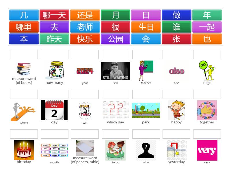 也 - also, 还是 - still, 本 - measure word (of books), 张 - measure word (of papers, table), 年 - year, 月 - month, 日 - day, 谁 - who, 哪里 - where, 哪一天 - which day, 昨天 - yesterday, 几 - how many, 老师 - teacher, 去 - to go, 会 - will, 公园 - park, 做 - to do, 一起 - together, 生日 - birthday, 很 - very, 快乐 - happy,
