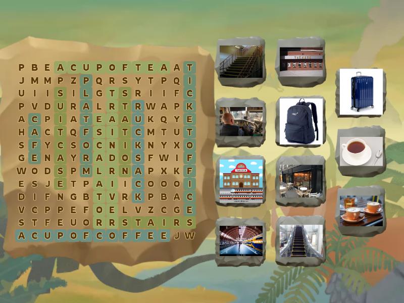 a cup of tea, station, platform, a cup of coffee, escalator, suitcase, ticket office, rucksack, train driver, stairs, cafe,