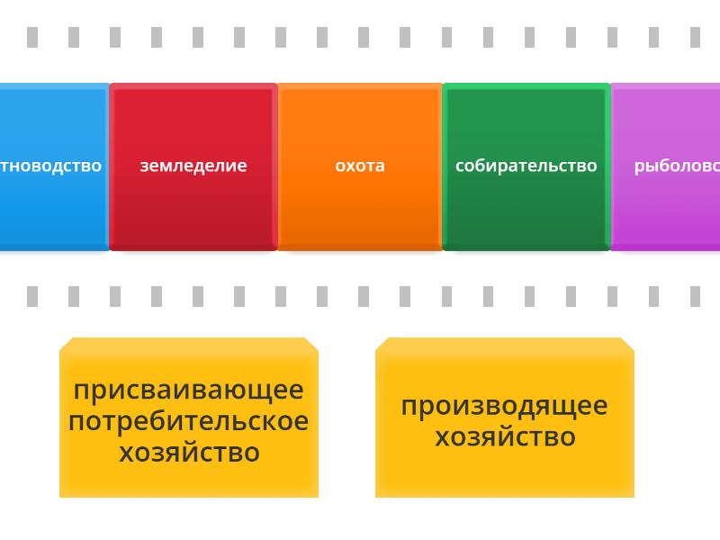 присваивающее потребительское хозяйство: рыболовство, охота, собирательство, производящее хозяйство : животноводство, земледелие,