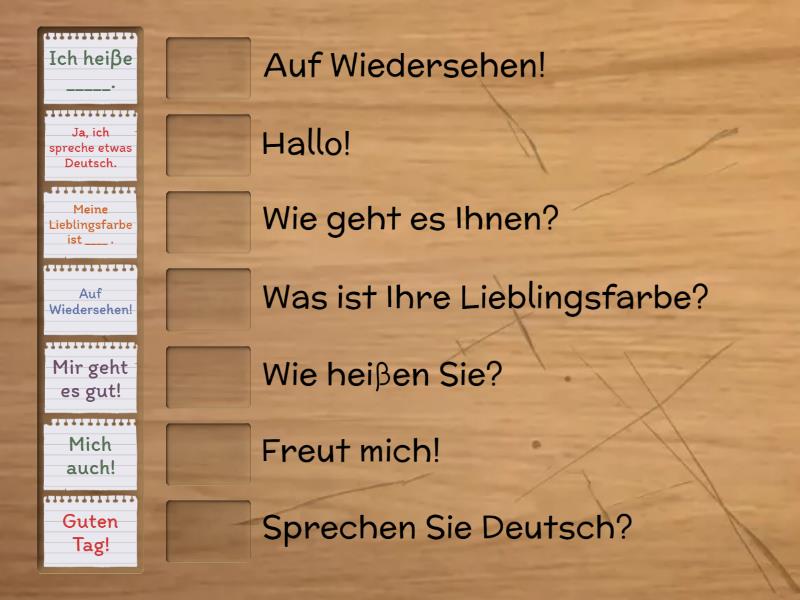 Guten Tag! - Hallo!, Ich heiβe _____. - Wie heiβen Sie?, Mich auch! - Freut mich!, Mir geht es gut! - Wie geht es Ihnen?, Ja, ich spreche etwas Deutsch. - Sprechen Sie Deutsch?, Meine Lieblingsfarbe ist ____ . - Was ist Ihre Lieblingsfarbe?, Auf Wiedersehen! - Auf Wiedersehen!,
