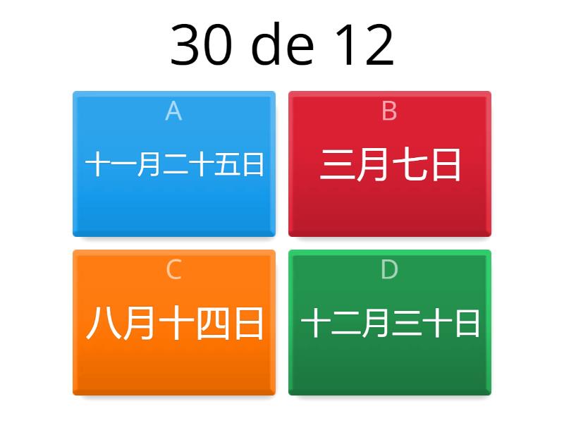 1) 30 de 12 a) 十一月二十五日 b) 三月七日 c) 八月十四日 d) 十二月三十日 2) 25 de 11 a) 九月二十一日 b) 十一月二十五日 c) 四月八日 d) 八月十四日 3) 7 de 3 a) 十二月三十日 b) 一月十七日 c) 三月七日 d) 十一月二十五日 4) 17 de 1 a) 十二月三十日 b) 十一月二十五日 c) 一月十七日 d) 八月十四日 5) 8 de 4 a) 十二月三十日 b) 三月七日 c) 十一月二十五日 d) 四月八日 6) 21 de 9 a) 九月二十一日 b) 十二月三十日 c) 八月十四日 d) 十一月二十五日 7) 14 de 8 a) 三月七日 b) 四月八日 c) 八月十四日 d) 十一月二十五日