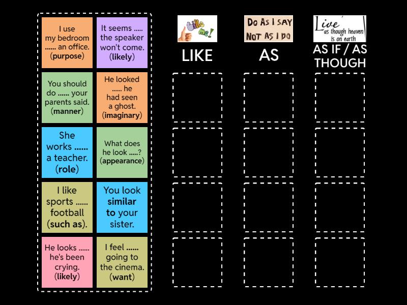 LIKE: You look similar to your sister. , I like sports ...... football (such as)., What does he look .....? (appearance), I feel ...... going to the cinema. (want), AS: She works ...... a teacher. (role), I use my bedroom ...... an office. (purpose), You should do ...... your parents said. (manner), AS IF / AS THOUGH: He looks ...... he's been crying. (likely), He looked ...... he had seen a ghost. (imaginary), It seems ..... the speaker won't come. (likely),