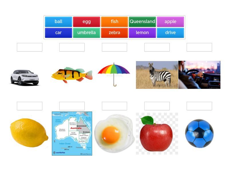 apple, ball, car, drive, egg, fish, lemon, Queensland, umbrella, zebra,