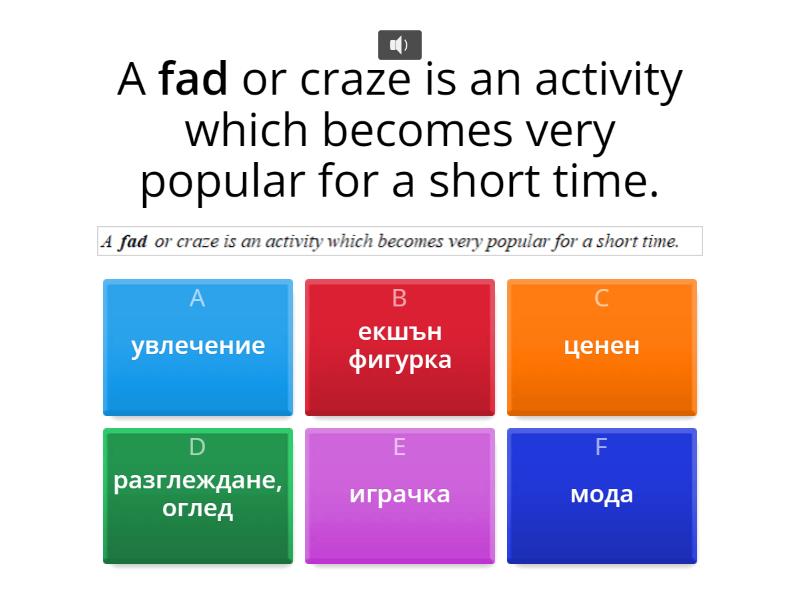 1) A fad or craze is an activity which becomes very popular for a short time. a) увлечение b) екшън фигурка c) ценен d) разглеждане, оглед e) играчка f) мода 2) Comics and action figures can become quite valuable. a) увлечение b) екшън фигурка c) ценен d) разглеждане, оглед e) играчка f) мода 3) That photo got a lot of views. a) увлечение b) екшън фигурка c) ценен d) разглеждане, оглед e) играчка f) мода 4) Things like toys and card-collecting used to be popular. a) увлечение b) екшън фигурка c) ценен d) разглеждане, оглед e) играчка f) мода 5) What’s in fashion at the moment? a) увлечение b) екшън фигурка c) ценен d) разглеждане, оглед e) играчка f) мода 6) What’s the first Marvel comic worth now, approximately? a) приблизително b) струващ c) комикс d) игрова конзола e) следя f) туит 7) What’s the first Marvel comic worth now, approximately? a) приблизително b) струващ c) комикс d) игрова конзола e) следя f) туит 8) What’s the first Marvel comic worth now? a) приблизително b) струващ c) комикс d) игрова конзола e) следя f) туит 9) Before games consoles, there were arcade games. a) приблизително b) струващ c) комикс d) игрова конзола e) следя f) туит 10) Do you follow anyone on Instagram? a) приблизително b) струващ c) комикс d) игрова конзола e) следя f) туит 11) Fans on social media look at their favourite celebrity tweets. a) приблизително b) струващ c) комикс d) игрова конзола e) следя f) туит 12) I’m a big comics fan. a) фен b) пъзел, загадка c) решавам d) аркадна игра e) герой f) последовател 13) The fastest time to solve the puzzle is less than 5 seconds. a) фен b) пъзел, загадка c) решавам d) аркадна игра e) герой f) последовател 14) The fastest time to solve the puzzle is less than 5 seconds. a) фен b) пъзел, загадка c) решавам d) аркадна игра e) герой f) последовател 15) Which arcade game had a hungry yellow hero? a) фен b) пъзел, загадка c) решавам d) аркадна игра e) герой f) последовател 16) Which arcade game had a hungry yellow hero? a) фен b) пъзел, загадка c) решавам d) аркадна игра e) герой f) последовател 17) Which footballer was the first to get 100 million Facebook followers? a) фен b) пъзел, загадка c) решавам d) аркадна игра e) герой f) последовател 18) Which is the best-selling game app of all time? a) приложение b) най-продаван c) следя d) ценен e) мода f) увлечение 19) Which is the best-selling game app of all time? a) приложение b) най-продаван c) следя d) ценен e) мода f) увлечение