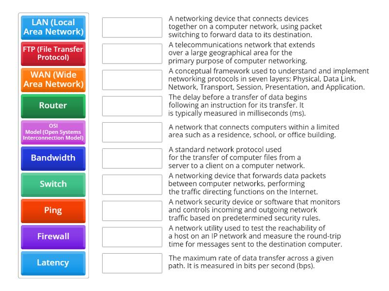 Router - A networking device that forwards data packets between computer networks, performing the traffic directing functions on the Internet., LAN (Local Area Network) - A network that connects computers within a limited area such as a residence, school, or office building., Firewall - A network security device or software that monitors and controls incoming and outgoing network traffic based on predetermined security rules., Bandwidth - The maximum rate of data transfer across a given path. It is measured in bits per second (bps)., Latency - The delay before a transfer of data begins following an instruction for its transfer. It is typically measured in milliseconds (ms)., Ping - A network utility used to test the reachability of a host on an IP network and measure the round-trip time for messages sent to the destination computer., OSI Model (Open Systems Interconnection Model) - A conceptual framework used to understand and implement networking protocols in seven layers: Physical, Data Link, Network, Transport, Session, Presentation, and Application., FTP (File Transfer Protocol) - A standard network protocol used for the transfer of computer files from a server to a client on a computer network., WAN (Wide Area Network) - A telecommunications network that extends over a large geographical area for the primary purpose of computer networking., Switch - A networking device that connects devices together on a computer network, using packet switching to forward data to its destination.,