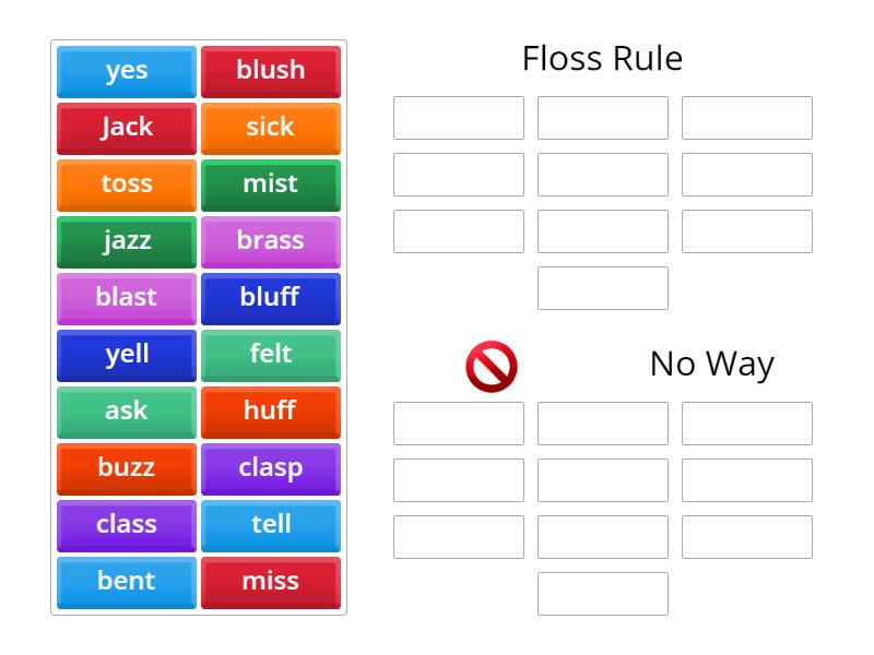 Floss Rule: brass, class, bluff, miss, yell, jazz, toss, tell, huff, buzz, No Way: blast, clasp, blush, mist, yes, Jack, sick, ask, felt, bent,