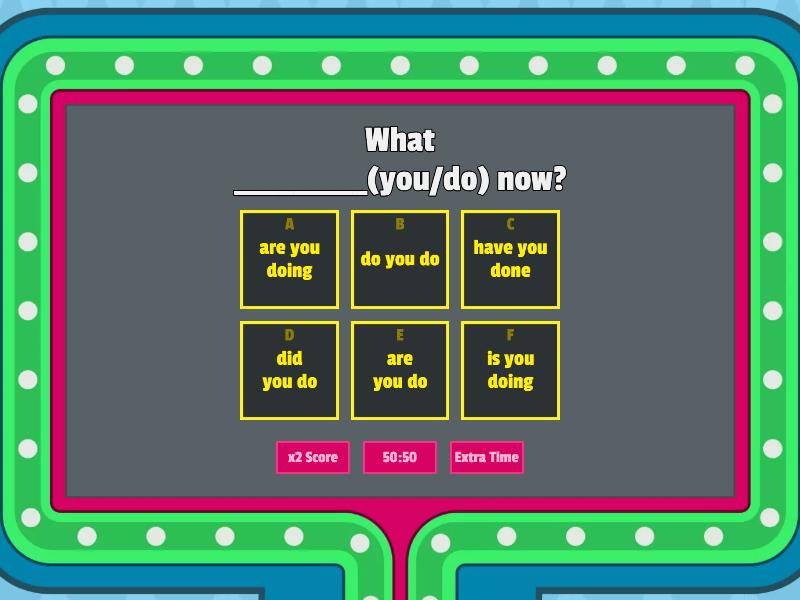1) What _________(you/do) now? a) are you doing b) do you do c) have you done d) did you do e) are you do f) is you doing 2) I_______________________(study) for the exam at the moment. a) am study b) am studing c) am studying d) study e) studies f) are studied 3) Marie (want)______________ to the cinema right now! a) is wanting b) wanted c) want d) wants e) wantes f) is wanted 4) We (not/have) _______________classes next week. a) not have b) aren't have c) aren't having d) don't have e) doesn't have f) don't has 5) Frankie (need) _________________ to buy a present for next Saturday. a) needs b) need c) is needing d) is need e) does need f) are need 6) (you/ travel) ________________ somewhere for next holidays? a) is you travelling b) do you travel c) are you travelling d) does you travel e) are you travel f) are you travelled 7) You _____________(work) together to complete this task now. a) work b) are work c) works d) is working e) are working f) are workin 8) _______your mum often ________ (buy) at the superkmarket? a) is - buying b) are - buying c) do - buy d) does - buys e) do - buys f) does - buy 9) I __________ (not/go) to school next week because classes are over. a) 'm not going b) are going   c) don't go d) aren't go e) doesn't go f) don't going 10) He doesn't usually have a good memory, but he __________(remember) a lot today! a) is remembering b) remember c) are remembering d) are remember e) remembers f) doesn't remember 11) I have never sat next to Nikki before, but this week she ___________ next to me because her bestie is ill. a) is sitting b) is siting c) are sitting d) is sit e) sits f) sit 12) What ______ you normally _______ for a party? a) are - wearing b) is - wearing c) do - wear d) does - wear e) do - wearing f) are - wear 13) William_______ (come) from Argentina and he ________(speak) Spanish and English. a) come - speak b) coming - speaking c) is coming - is speaking d) comes - speaks e) comes - speaking f) does comes - speak 14) Students from B07 usually _________ (practise) English at home and ________ (study) every day. a) practises - studies b) practise - study c) are practising - studying d) are practised - are studied e) practising - studying 15) Angela and Bianca _____(be) best friends and usually _____(go) out together. They _______(have) dinner tonight. a) are being - are going - are having b) are - are going - are having c) are - go - are having d) is - goes - have e) are - are going - are having f) are - go - have