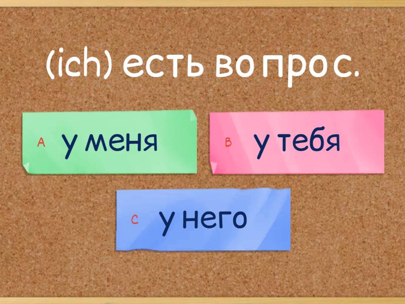 1) (ich) есть вопрос. a) у меня b) у тебя c) у него 2) (Sie) есть много денег. a) у Вас b) у нас c) у нее 3) (er) есть брат. a) у него b) у его c) у нее d) у ее 4) (sie) есть муж. a) у него b) у его c) у нее d) у ее 5) (Ich) есть часы a) у тебя b) у нас c) у него d) у меня 6) (wir) есть стулья. a) у вас b) у нас c) у них 7) (sie Pl.) сегодня борщ на обед. a) у нас b) у них c) у вас 8) (ihr) сегодня макароны на ужин. a) у нас b) у вас c) у них 9) (Du) сегодня круассан и чай на завтрак? a) у меня b) у него c) у тебя 10) (Du) много друзей в деревне? a) у меня b) у тебя c) у вас 11) (er) еще много вопросов? a) у него b) у вас c) у его