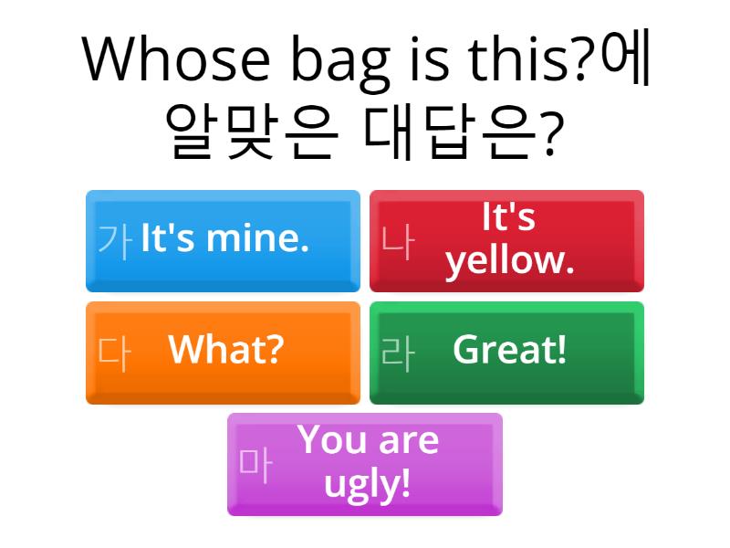 1) Whose bag is this?에 알맞은 대답은? a) It's mine. b) It's yellow. c) What? d) Great! e) You are ugly! 2) () 안에 있는 단어는? (retpocileh) a) helicopter b) pencil c) net d) oil e) internet 3) 대, 소문자의 유의하여 보기의 문장을 다시 쓴 것은? (보기 : IT'S MINE.) a) it's mine. b) It's mine. c) It's Mine. d) Its mine. e) It'S mine 4) ()에 들어갈 단어는? Whose bag () this? a) baby b) happy c) is d) 필요없음. e) are 5) ()안에 단어를 넣어 단어를 완성하세요. hel()copter a) i b) u c) a d) e e) o