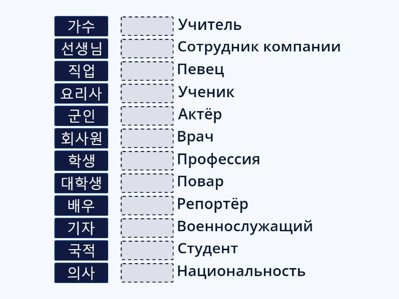 직업 - Профессия, 학생 - Ученик, 대학생 - Студент, 의사 - Врач, 가수 - Певец, 요리사 - Повар, 선생님 - Учитель, 국적 - Национальность, 군인 - Военнослужащий, 배우 - Актёр, 회사원 - Сотрудник компании, 기자 - Репортёр,