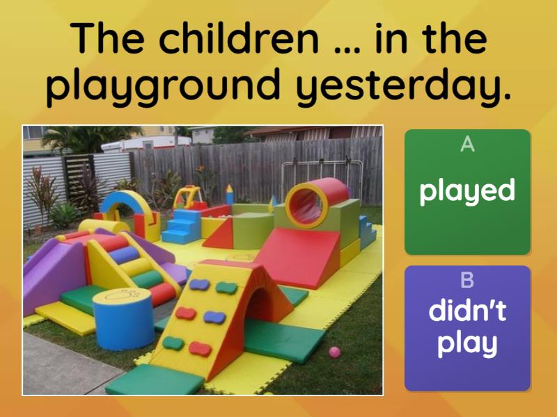 1) The children ... in the playground yesterday. a) played b) didn't play 2) My mother ... soup yesterday.  a) cooked b) didn't cook 3) She ... to music last week. a) listened b) didn't listen 4) Jim ... basketball last week. a) played b) didn't play 5) Ann ... apples.  a) didn't eat b) ate 6) I ... ice cream. a) didn't buy b) bought 7) She ... English at school. a) didn't study b) studied 8) They ... the fence. a) painted b) didn't paint