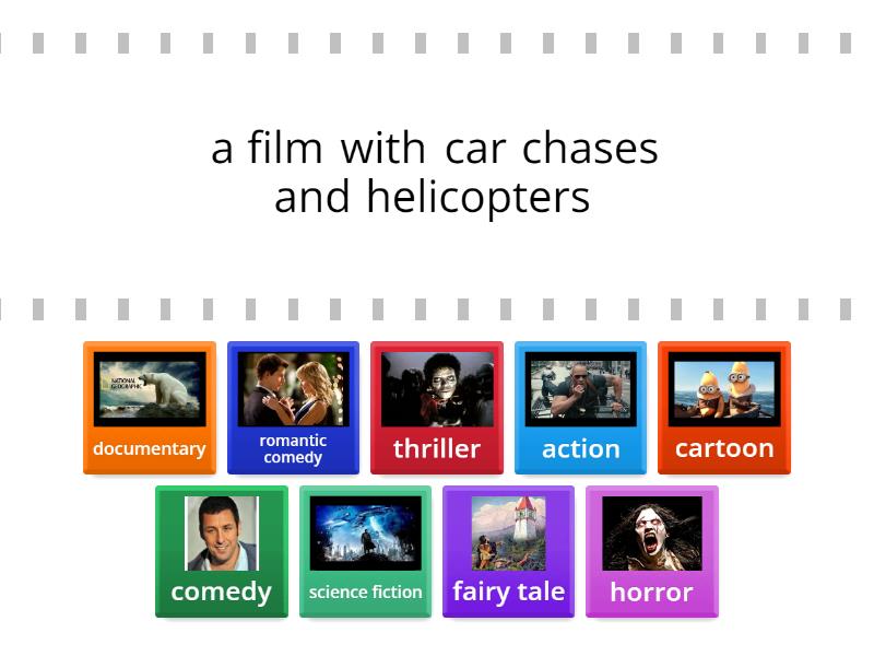 action - a film with car chases and helicopters, thriller - a film with a lot of tension and suspence, documentary - a film about animals or about a historic event, comedy - a funny film, horror - a scary film, romantic comedy - a funny film about love, science fiction - a film set in a fictitious world in the future, cartoon - a film made with computer graphics or drawings, fairy tale - a traditional story written for children that usually involves imaginary creatures and magic,