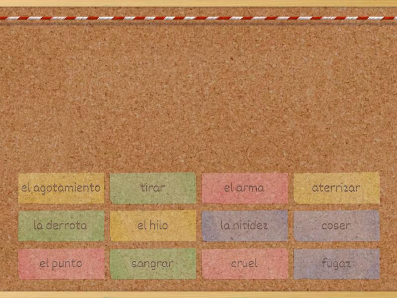 tirar - бросать, el punto - точка, fugaz - мимолётный, aterrizar - приземляться, sangrar - кровоточить, el arma - оружие, coser - шить, el hilo - нить, la derrota - поражение, cruel - жестокий, la nitidez - чёткость, el agotamiento - выгорание,