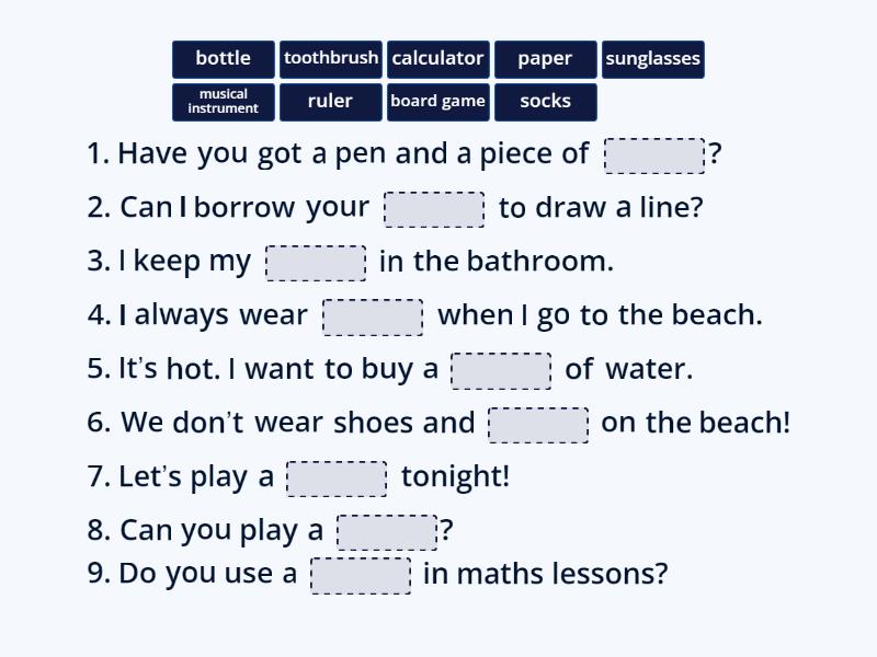 1. Have you got a pen and a piece of ____? 2. Can I borrow your ____ to draw a line? 3. I keep my ____ in the bathroom. 4. I always wear ____ when I go to the beach. 5. It’s hot. I want to buy a ____ of water. 6. We don’t wear shoes and ____ on the beach! 7. Let’s play a ____ tonight! 8. Can you play a ____? 9. Do you use a ____ in maths lessons? 1. We usually eat soup with a ____. 2. Wash your hands carefully with ____ and hot water 3. My ____ wakes me at eight every morning. 4. Waiter! I’ve got a knife but no ____. 5. Do you think this ____ opens that door? 6. We can’t play a board game. We haven’t got any ____. 1. Would you like a ____ of tea? 2. You’ll need some money, so don’t forget your ____. 3. I’d like a ____ for this soup, please. 4. I want to wash my hands, but there’s no ____ in the bathroom. 5. In most countries in Europe, people eat meals with a ____ and fork.