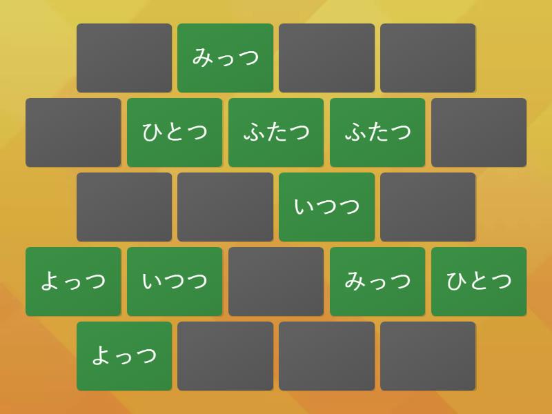 ひとつ, ふたつ, みっつ, よっつ, いつつ, むっつ, ななつ, やっつ, ここのつ, とお, いくつ?,