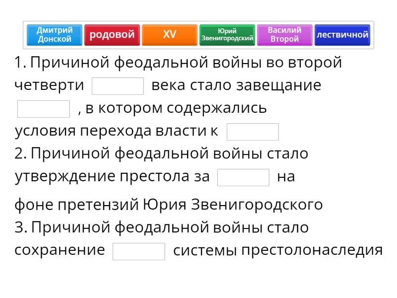 1. Причиной феодальной войны во второй четверти ____ века стало завещание ____ , в котором содержались условия перехода власти к ____ 2. Причиной феодальной войны стало утверждение престола за ____ на фоне претензий Юрия Звенигородского 3. Причиной феодальной войны стало сохранение ____ системы престолонаследия 1. ____ пользовался большим авторитетом: отец ____ , крестил ____ 2. ____ был поддержан ____ , церковью 1. В ____ году в ____ на пиру по случаю свадьбы ____ на сыне Юрия Звенигородского - ____ - был замечен золотой пояс ____ , считавшийся украденным 2. Мать Василия Второго ____ ____ этот пояс, что оскорбило семью Юрия 1. В борьбе между собой внуки ____ применяли варварские методы: ____, пленив Василия Юрьевича, ослепил его на один глаз, ввиду чего тот был прозван ____ 2. В ____ году заговорщики во главе с ____ захватили Троице-Сергиев монастырь, в котором был арестован Василий Второй 3. Князя привезли в Москву, где ему выкололи глаза, за что он получил прозвище ____ 1. Последствием междоусобной войны войны стал отказ от ____ системы престолонаследия 2. Междоусобная война привела к разорению ____ княжества, что замедлило процесс ____ земель 3. Окончание междоусобной войны укрепило власть князя, который сумел навязать ____ Новгороду в 1456 году, что способствовало постепенному присоединению новгородских земель к ____