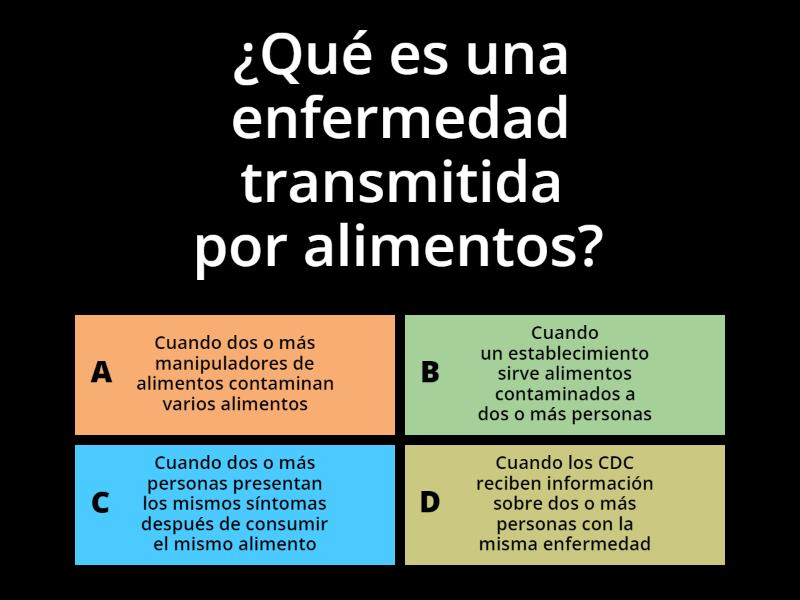 1) ¿Qué es una enfermedad transmitida por alimentos? a) Cuando dos o más manipuladores de alimentos contaminan varios alimentos b) Cuando un establecimiento sirve alimentos contaminados a dos o más personas c) Cuando dos o más personas presentan los mismos síntomas después de consumir el mismo alimento d) Cuando los CDC reciben información sobre dos o más personas con la misma enfermedad 2) ¿Cuál de estos es un alimento listo para comer? a) Arroz sin cocinar b) Pollo crudo deshuesado c) Sal de mar d) Ejotes verdes sin lavar 3) ¿Por qué los niños en edad preescolar corren más riesgo de contraer enfermedades transmitidas por alimentos? a) Porque no han desarrollado sistemas inmunológicos fuertes. b) Porque es más probable que los hospitalicen. c) Porque es más probable que sufran reacciones alérgicas d) Porque su apetito es mayor que cuando nacieron. 4) ¿Cuál de estos es un alimento TCS (que necesita control de tiempo y temperatura para su seguridad)? a) Pan b) Harina c) Brotes vegetales d) Fresas 5) Los cinco errores comunes que provocan enfermedades transmitidas por alimentos son: no cocinar correctamente los alimentos, mantener los alimentos a temperaturas incorrectas, usar equipo contaminado, tener malos hábitos de higiene personal y… a) recalentar las sobras de alimentos. b) servir alimentos listos para comer. c) usar guantes desechables de un solo uso. d) comprar alimentos a proveedores con seguridad deficiente. 6) En la mesa de preparación se dejan pechugas de pollo crudas a temperatura ambiente. ¿Qué factor de riesgo podría causar causar una enfermedad transmitida por alimentos? a) Contaminación cruzada b) Mala hábitos de higiene personal c) Abuso de tiempo y temperatura d) Limpieza y sanitización deficientes 7) ¿Qué es un alimento TCS? a) Alimento que requiere revisiones con el termómetro para su seguridad b) Alimento que requiere condiciones confiables para poder servirse c) Alimento que requiere de un compromiso de entrenamiento con los estándares d) Alimento que necesita control de tiempo y temperatura para su seguridad 8) Un manipulador de alimentos deja una bandeja con pechugas de pavo a temperatura ambiente toda la noche para que se descongelen. Además de tirar el pavo, ¿cuál es otra acción correctiva apropiada? a) Completar un informe sobre el incidente. b) Ordenar más pechugas e pavo. c) Deducir el costo de las pechugas de pavo del salario del manipulador de alimentos. d) Asegurarse de que el manipulador de alimentos comprende las prácticas seguras para enfriar alimentos. 9) ¿Cuál es una de las medidas importantes para prevenir las enfermedades transmitidas por los alimentos? a) Usar equipo nuevo b) Medir el nivel de patógenos c) Prevenir la contaminación cruzada d) Servir alimentos orgánicos locales 10) ¿Cuál es una de las posibles funciones de una autoridad reguladora local? a) Asegurar que los alimentos sean atractivos para el consumidor b) Inspeccionar un establecimiento c) Monitorear las ganancias del establecimiento d) Proteger la marca registrada de un producto
