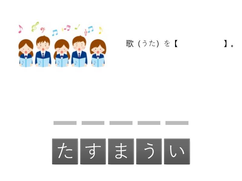 します - スピーチを【      】。, なります - チャイムが【      】。, つたえます - みんなに今日(きょう)の予定(よてい)を【      】。, うたいます - 歌(うた)を【      】。, きます - 先生(せんせい)が教室(きょうしつ)に【      】。, あります - 体育(たいいく)が【      】。, きめます - 遊(あそ)びを【      】。,