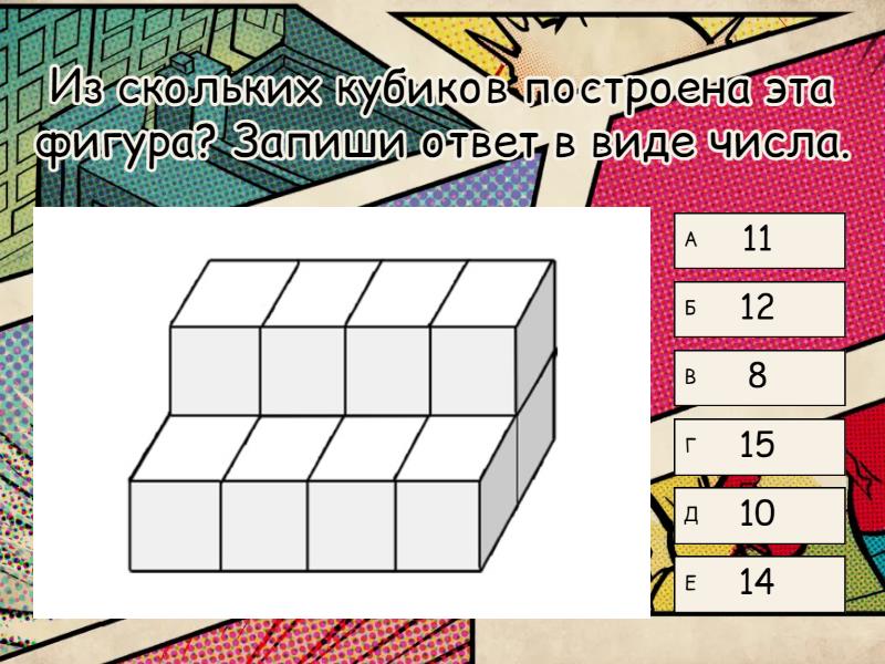 1) Из скольких кубиков построена эта фигура? Запиши ответ в виде числа. a) 11 b) 12 c) 8 d) 15 e) 10 f) 14 2) Как будет выглядеть кубик в сложенном виде? a) 1 b) 2 c) 3 d) 4 3) Какой из шаблонов нужно выбрать, чтобы сложить коробку на рисунке? a) A b) B c) C d) G e) D f) E 4) Когда кубик стоит так, как показано на рисунке, то внизу у него будет фиолетовая грань, сзади —зелёная, а слева — белая. Мысленно перекатывай кубик по изображенному пути. Представь, что каждый раз грань, которая оказалась внизу, будет оставлять на клетках отпечаток. Какой отпечаток будет в выделенной клетке? a) Красный  b) Голубой  c) Оранжевый  d) Фиолетовый e) Зеленый  5) Мысленно совмести эти две фигуры. Какая фигура при этом получится? a) 1 b) 2 c) 3 d) 4