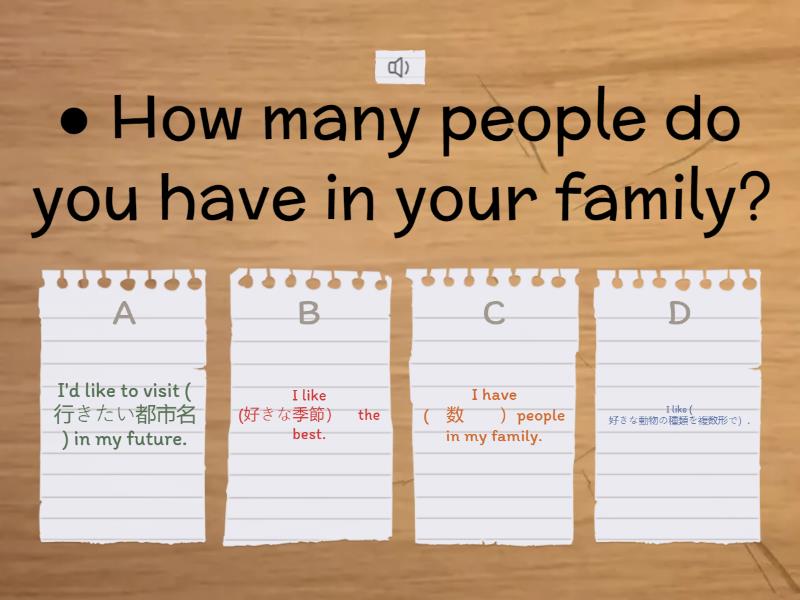 1) ● How many people do you have in your family? a) I'd like to visit ( 行きたい都市名 ) in my future. b) I like (好きな季節) the best. c) I have ( 数  )people in my family. d) I like ( 好きな動物の種類を複数形で). 2) ● What city would you like to visit in the future? a) I ( 昨日したことを過去形で)yesterday. b) I'd like to visit ( 行きたい都市名 ) in my future. c) I have ( 数  )people in my family. d) I like ( 好きな動物の種類を複数形で). 3) ● What country do you want to go to? a) I like (好きな季節) the best. b) I want to go to ( 行きたい国 ).  c) I like to (暑い日にしたいこと)when the weather is hot d) I ate (食べたもの)this morning. 4) ● What did you do yesterday? a) I ate (食べたもの)this morning. b) I like (好きな方)better. c) I usually eat dinner at (夕飯を食べる時間). d) I ( 昨日したことを過去形で)yesterday. 5) ● What did you eat this morning? a) I'd like to visit ( 行きたい都市名 ) in my future. b) I ate (食べたもの)this morning. c) I like ( 好きな方の季節) better. d) I have ( 数  )people in my family. 6) ● What do you like to do when the weather is hot? a) I usually study ( 勉強する時間の数)hour(s) every day. b) I like to (暑い日にしたいこと)when the weather is hot c) I ( 昨日したことを過去形で)yesterday. d) I want to go to ( 行きたい国 ).  7) ● What kind of animals do you like? a) I like ( 好きな動物の種類を複数形で). b) I usually study ( 勉強する時間の数)hour(s) every day. c) I ate (食べたもの)this morning. d) I like ( 好きな方の季節) better. 8) ● What season do you like the best? a) I like ( 好きな方の季節) better. b) I usually study ( 勉強する時間の数)hour(s) every day. c) I ate (食べたもの)this morning. d) I like (好きな季節) the best. 9) ● What time do you usually eat dinner? a) I want to go to ( 行きたい国 ).  b) I like (好きな方)better. c) I like ( 好きな動物の種類を複数形で). d) I usually eat dinner at (夕飯を食べる時間). 10) ● Which do you like better, summer or winter? a) I ate (食べたもの)this morning. b) I like (好きな季節) the best. c) I usually eat dinner at (夕飯を食べる時間). d) I like ( 好きな方の季節) better. 11) ● Which do you like better, TV or the Internet? a) I ate (食べたもの)this morning. b) I like ( 好きな方の季節) better. c) I like (好きな方)better. d) I want to go to ( 行きたい国 ).  12) ● How many hours do you usually study every day? a) I usually study ( 勉強する時間の数)hour(s) every day. b) I usually eat dinner at (夕飯を食べる時間). c) I like to (暑い日にしたいこと)when the weather is hot d) I like (好きな季節) the best.