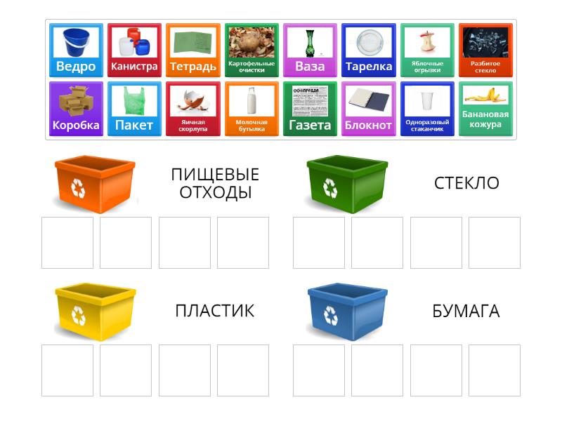 ПИЩЕВЫЕ ОТХОДЫ: Банановая кожура, Картофельные очистки, Яичная скорлупа, Яблочные огрызки, СТЕКЛО: Разбитое стекло, Молочная бутылка, Тарелка, Ваза, ПЛАСТИК: Пакет, Ведро, Канистра, Одноразовый стаканчик, БУМАГА: Коробка, Газета, Блокнот, Тетрадь,