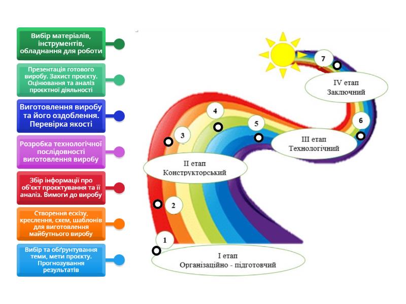 Вибір та обґрунтування теми, мети проєкту. Прогнозування результатів, Збір інформації про об'єкт проєктування та її аналіз. Вимоги до виробу, Створення ескізу, креслення, схем, шаблонів для виготовлення майбутнього виробу, Вибір матеріалів, інструментів, обладнання для роботи, Розробка технологічної послідовності виготовлення виробу, Виготовлення виробу та його оздоблення. Перевірка якості, Презентація готового виробу. Захист проєкту. Оцінювання та аналіз проєктної діяльності.